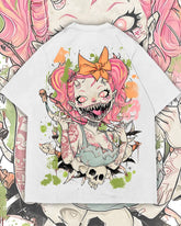This tee mixes cute and creepy in the best way possible. The bright colors and playful vibe hide something darker underneath — a mix of sugar and chaos. Candy Gore feels like a smile with sharp teeth, playful but dangerous, weirdly fun and a little messed up. It’s made for the ones who like their style loud, wild, and just a bit wrong.